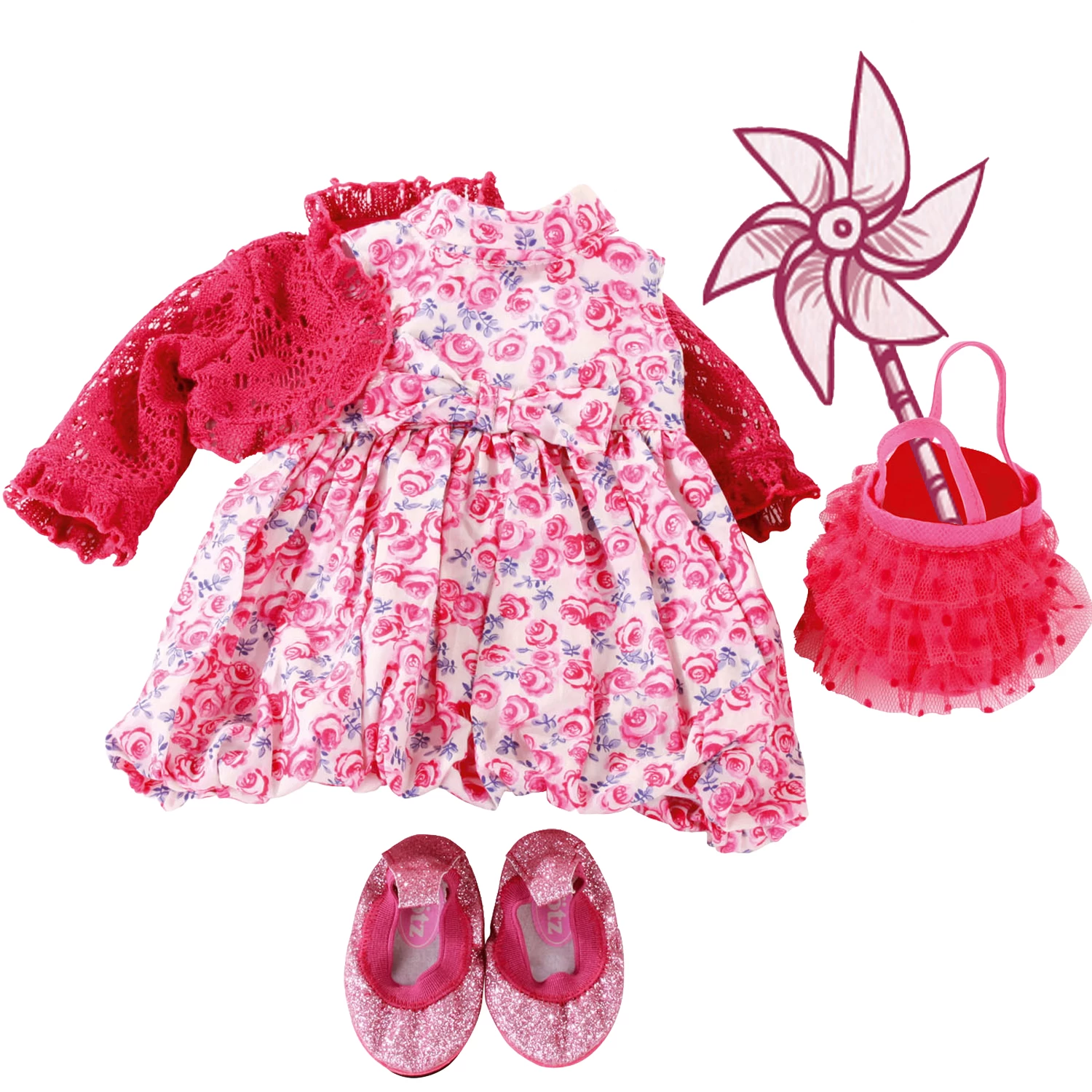 Het volgende feestje staat al weer voor de deur en je bent nog op zoek voor een spetterende outfit voor je pop? Met deze kledingset is ze op en top gekleed. Een hele mooie jurk, vestje, een handtas en bijapssende ballerinaβs. en alles in zilver-rose- perfect! Geschikt voor poppen van 45 β 50 cm.
