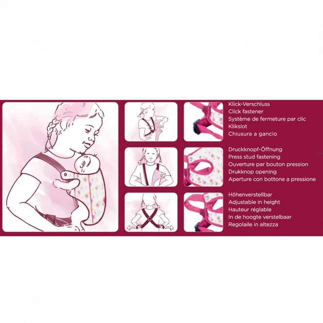 Als je gaat wandelen, kruipt je babypop tegen je aan en heb je je handen vrij. Een praktische drager in zachte kleuren. Je hebt maar een paar klikken nodig tot de drager goed past en je pop een veilige zitplaats heeft.