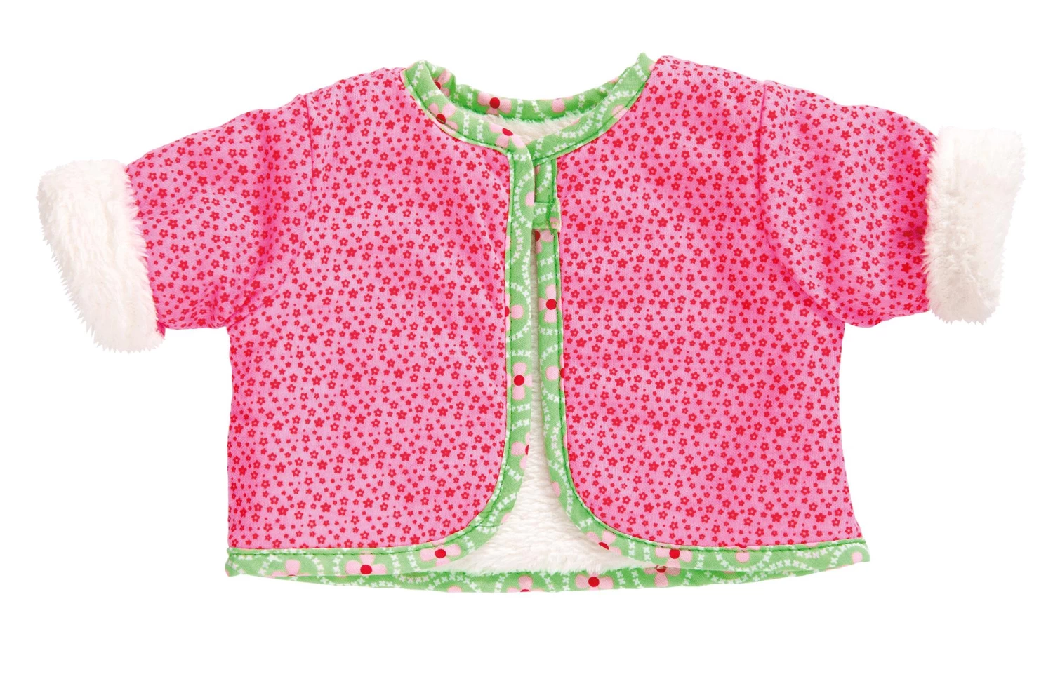 Kledingsetje bestaande uit een jasje en een broek. Het jasje kan aan 2 zijden gedragen worden. M.n. de witte stof van het jasje voelt heel zacht en knuffelig aan. compleet met kleerhangertje.