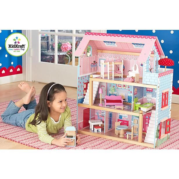 Dit poppenhuis wordt geleverd incl. maar liefst 19 meubelstukken, zoals een prachtige vleugelpiano en stapelbedden met een ladder.