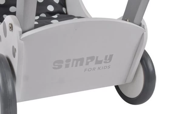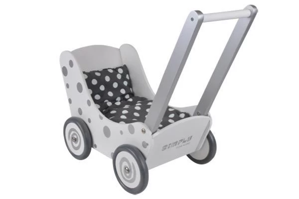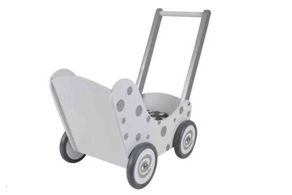 Vrolijke houten poppenwagen, wit met zilveren stippen, inclusief bijpassend poppendekentje. Met duwstang en rubberen wielen.