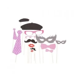 Deze dame is klaar voor een photoshoot met al haar feestelijke accessoires van een masker, stropdas, Franse alpinopet, snor en zonnebrillen. Ook voor haar poppenmoeder zijn er dezelfde accessoires.